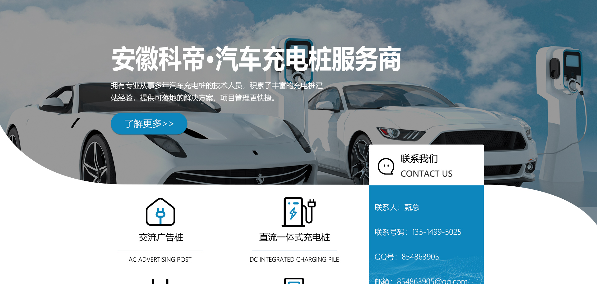 關(guān)于我們安徽科帝新能源科技有限公司坐落于安徽省會(huì)-合肥,是一家研發(fā)、生產(chǎn)智能充電樁設(shè)備,汽車(chē)充電站后臺(tái)監(jiān)控管理系統(tǒng)和生產(chǎn)高壓開(kāi)關(guān)設(shè)備的企業(yè).由專(zhuān)門(mén)的研發(fā)團(tuán)隊(duì)、管理團(tuán)隊(duì)按照現(xiàn)代化企業(yè)制度規(guī)范設(shè)立的有限責(zé)任公司。致力于為能源智能、安全的應(yīng)用和節(jié)能減排提供整體的技術(shù)與產(chǎn)品解決方案??频奂邪l(fā)、設(shè)計(jì)、生產(chǎn)、銷(xiāo)售以及服務(wù)于一體,在電動(dòng)汽車(chē)充電方案,充電設(shè)施建設(shè)和城市配電方面擁有廣泛的技術(shù)研究及經(jīng)驗(yàn)積累,為客戶(hù)提供安全、智能的充電設(shè)備及充電運(yùn)營(yíng)站建設(shè)一體化解決方案。并堅(jiān)持以人為本、質(zhì)量為先、顧客至上、不斷創(chuàng)新”的企業(yè)理念,為能源行業(yè)的發(fā)展、節(jié)能減排做出重大的貢獻(xiàn)。公司擁有豐富的產(chǎn)品種類(lèi),目前科帝已研發(fā)生產(chǎn)了三十多種產(chǎn)品,充電設(shè)備有直流一體式充電樁、直流分體式充電樁、直流廣告樁、交流廣告樁、廣告一體樁、壁掛交直流樁;等多種充電設(shè)備;每一款產(chǎn)品都是精心打造,力求為客戶(hù)提供優(yōu)越的用戶(hù)體驗(yàn)。展望未來(lái)科帝將通過(guò)持續(xù)的自...